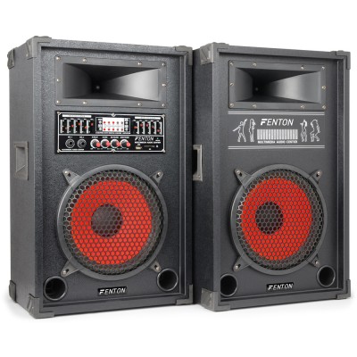 A stereo karaoke active speaker set with a red 10" cone woofer and built-in high power digital amplifier, adjustable microphone delay and echo effect, USB and SD inputs, 2 microphone inputs, selectable line input and a 5-band individual equalizer for L/R channels. Suitable for exhibitions, fairs, (karaoke) shows etc.