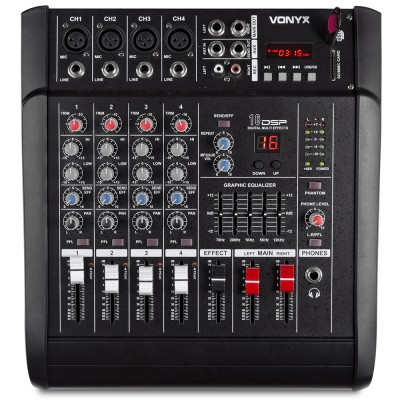 This 5-channel mixer holds a 2x 500W amplifier. Giving the user a complete unit as base for this setup. With 4 microphone and line inputs it's ideal for live performers on stage. 16 digital effects give you plenty of room to fine tune your sound.