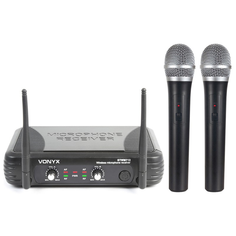 A dual channel VHF wireless microphone system with two handheld microphones. Both transmitters work on different frequencies. Good sound quality and reliable thanks to the VHF technique. Ideal for on stage, vocalists, presentations etc.